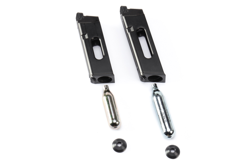 ※G17 CO2マガジンにG19グリップ用マガジンバンパーを装着したマガジンです。 ストッパー(マガジンバンパーをロックするパーツ)が長くなるため、G17 CO2マガジンより装弾数が減ります。